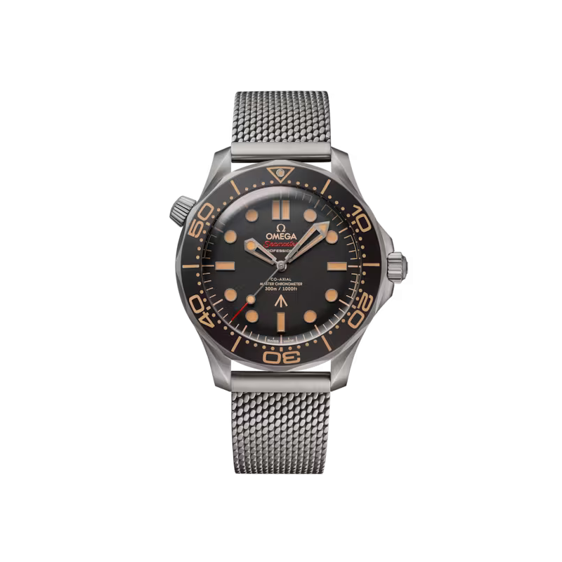 Identique à la montre que James Bond porte dans Mourir peut attendre, cette Seamaster de 42 mm en titane grade 2, à la fois robuste et légère, arbore un cadran et une lunette en aluminium brun tropical.