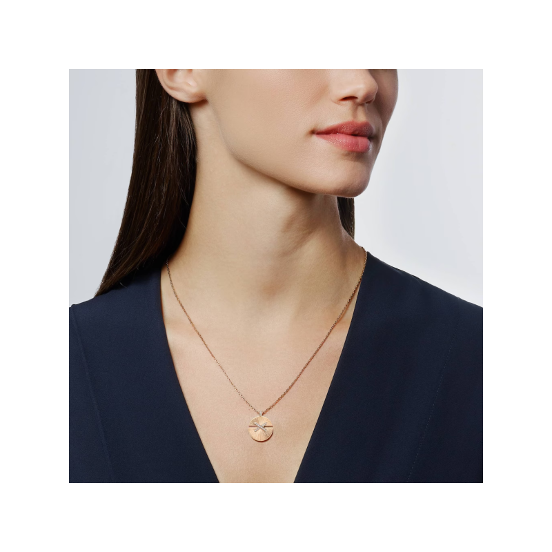 Jeux de Liens Harmony réinterprète les bijoux de sentiment chers à la Maison, dans un esprit asymétrique. Écho au savoir-faire d’orfèvre de Chaumet, la médaille Jeux de Liens Harmony se pare d’or soleillé, figurant un rayonnement raffiné. De la bélière au motif central, en passant par la tranche, chaque détail de cette médaille est serti de diamants, redoublant d’élégance.
