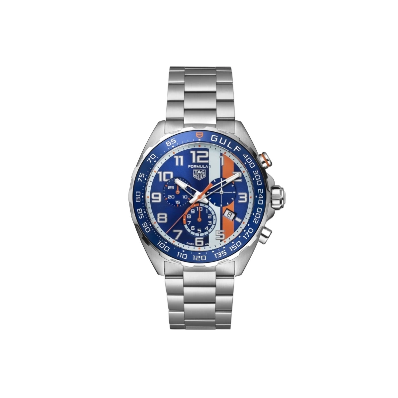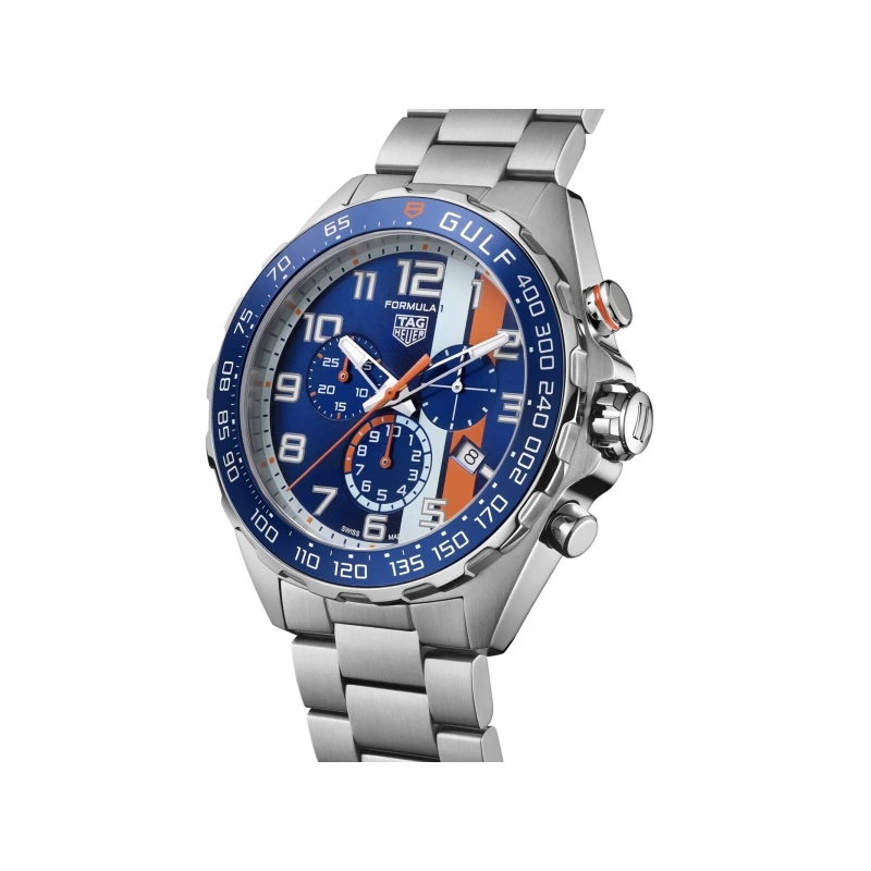 Bold and energetic, this chronograph makes a lasting impression of the legendary partnership between TAG Heuer and Gulf. Sporting Gulf’s emblematic blue and orange livery, this racing-inspired 43mm watch is ready to outpace with style.